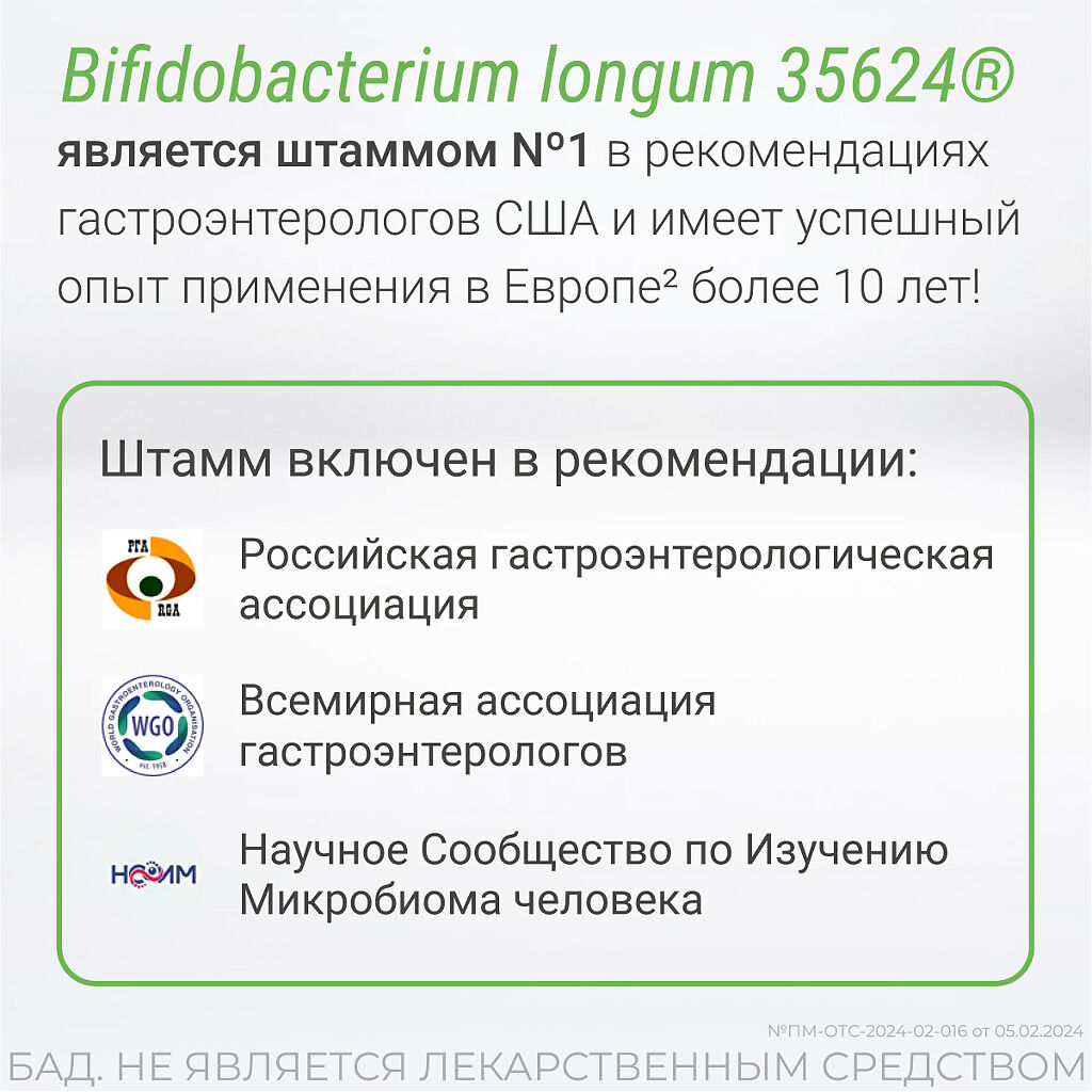Bifidobacterium longum longum, штамм 35624® - 1х10⁹ КОЕ (один миллиард бактерий)*, крахмал кукурузный, стабилизатор (Е470), сахароза, трегалоза, стабилизатор (Е331). Обо-лочка капсулы содержит: гипромеллоза (Е464). *на момент выпуска.