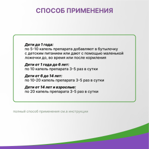 | Дети до 1 года | по 5–10 капель препарата добавляют в бутылочку с детским питанием или дают с помощью маленькой ложечки до, во время или после кормления |