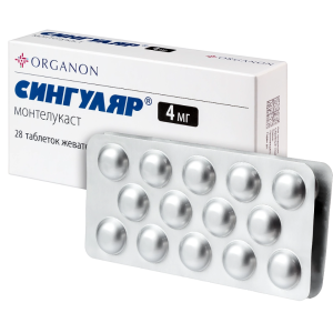 При бронхиальной астме и аллергическом рините: 1 таблетка СИНГУЛЯРа на ночь.