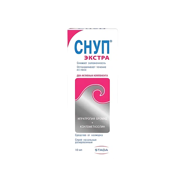 Одно вспрыскивание препарата Снуп® Экстра содержит около 70 мкг ксилометазолина гидрохлорида и 84 мкт ипратропия бромида.