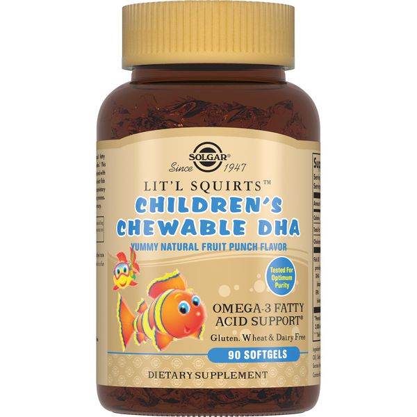 Бренд Solgar (Солгар) - всемирно известный производитель высокоэффективных натуральных препаратов для здоровья. Жевательные капсулы для детей «Золотые рыбки Солгар» ( Lit'l Squirts™ Chewable DHA Softgels) - сбалансированный состав. Солгар «Золотые рыбки» - источник полиненасыщенных жирных кислот семейства омега-3 (преимущественно докозагексаеновой), которые являются важнейшими компонентами здорового питания. Солгар «Золотые рыбки» - жевательные капсулы с рыбьим жиром. Производитель предусмотрел все нюансы, чтобы ребенок не отказывался от этого препарата. Необычная форма и приятный фруктовый вкус капсулы очень нравится детям. Докозагексаеновая кислота (ДГК) - главная жирная кислота в составе фосфолипидов головного мозга, являющихся строительными блоками клеточных мембран. Головной мозг примерно на 60% состоит из жиров, 25% из которых составляет ДГК. При достаточном количестве ДГК клетки мозга функционируют наиболее эффективно. Исследования подтверждают, что недостаточный прием ДГК приводит к гиперактивности, снижению концентрации внимания. Оптимальное количество ДГК в клетках мозга помогает сохранять спокойствие, снизить возбуждение, неугомонность, эмоциональные вспышки и раздражительность у детей. Также дополнительный прием ДГК помогает повысить умственные способности, концентрацию внимания, улучшить память, в том числе запоминание слов. Содержат высокоочищенную стабильную ДГК, полученную из тунца методом холодной экстракции. Солгар «Золотые рыбки» обладают приятным вкусом, не содержат сахара, соли, крахмала, дрожжей, клейковины, молочных компонентов или каких-либо синтетических добавок. Солгар «Золотые рыбки» не оставляют привкуса рыбы во рту.