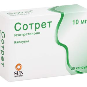 Беременность — абсолютное противопоказание для терапии препаратом Сотрет, активным веществом которого является изотретиноин. Изотретиноин обладает сильным тератогенным действием. Если беременность возникает, несмотря на предостережения, во время лечения изотретиноином (внутрь, в любой дозе и даже непродолжительное время) или в течение месяца после окончания терапии, существует очень большая опасность рождения ребенка с тяжелыми пороками развития.