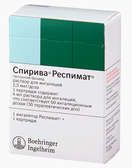 Ингалятор СПИРИВА РЕСПИМАТ содержит 60 ингаляционных доз (т.е. 30 терапевтических доз) при условии применения в соответствии с указаниями (2 ингаляционные дозы 1 раз в день).
