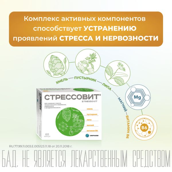 СТРЕССОВИТ® – комплекс компонентов, способствующих снижению психоэмоционального напряжения, снятию стресса, улучшению функционирования и восстановлению нервной системы, улучшению общего самочувствия и повышению работоспособности.