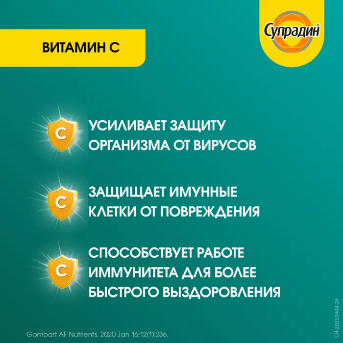 Супрадин иммуно витамин С - способствует повышению сопротивляемости организма к инфекциям и усиленной выработке антител.