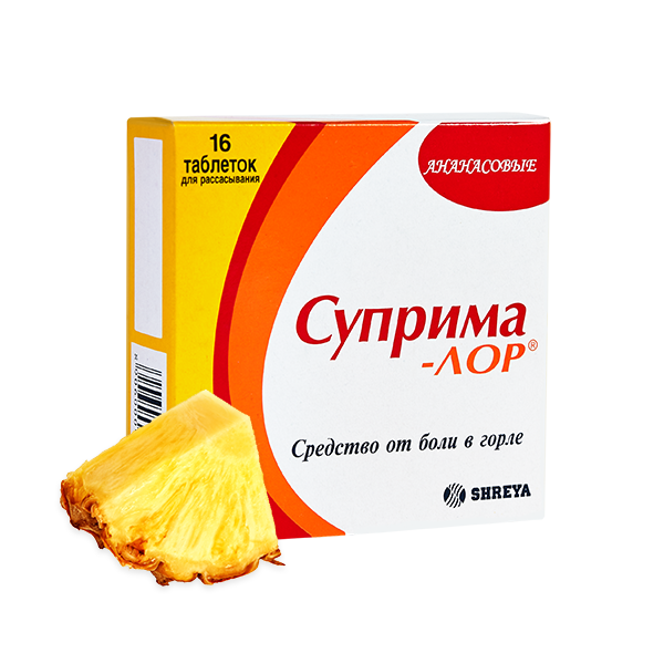 Суприма-ЛОР ананасовые: сахароза, декстроза, лимонная кислота, левоментол, краситель солнечный закат желтый (Е 110), краситель хинолиновый жёлтый (Е 104), ароматизатор ананасовый