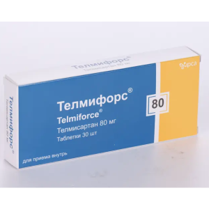 Телмифорс® (телмисартан) — специфический антагонист рецепторов ангиотензина II (АРА II) (типа AT1), эффективный при приёме внутрь. Обладает высоким сродством к подтипу AT1-рецепторов ангиотензина II, через которые реализуется действие ангиотензина II. Вытесняет ангиотензин II из связи с рецептором, не обладая действием агониста в отношении этого рецептора. Телмисартан связывается только с подтипом AT1-рецепторов ангиотензина II. Связь носит длительный характер. Не обладает сродством к другим рецепторам, в том числе к АТ2-рецептору и другим, менее изученным рецепторам ангиотензина. Функциональное значение этих рецепторов, а также эффект их возможной избыточной стимуляции ангиотензином II, концентрация которого увеличивается при назначении телмисартана, не изучены. Телмисартан снижает концентрацию альдостерона в крови, не ингибирует ренин в плазме крови и не блокирует ионные каналы. Телмисартан не ингибирует ангиотензинпревращающий фермент (кининаза II) (фермент, который также разрушает брадикинин). Поэтому усиление вызываемых брадикинином побочных эффектов не ожидается.