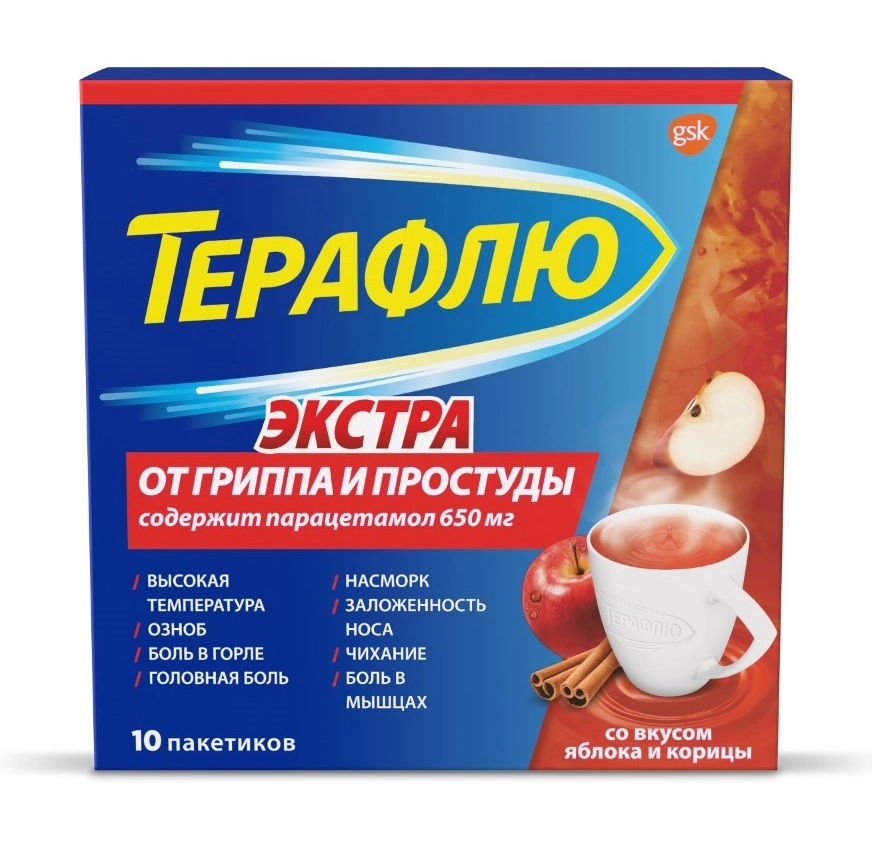 ТераФлю от гриппа и простуды Экстра порошок для приготовления раствора для приема внутрь с ароматом и вкусом корицы и яблока пакетики №10