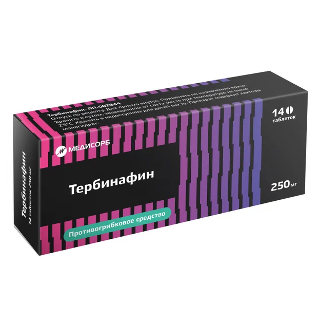 активное вещество: тербинафина гидрохлорид (в пересчёте на тербинафин) — 140,5 мг (125 мг) или 281,0 мг (250 мг)
