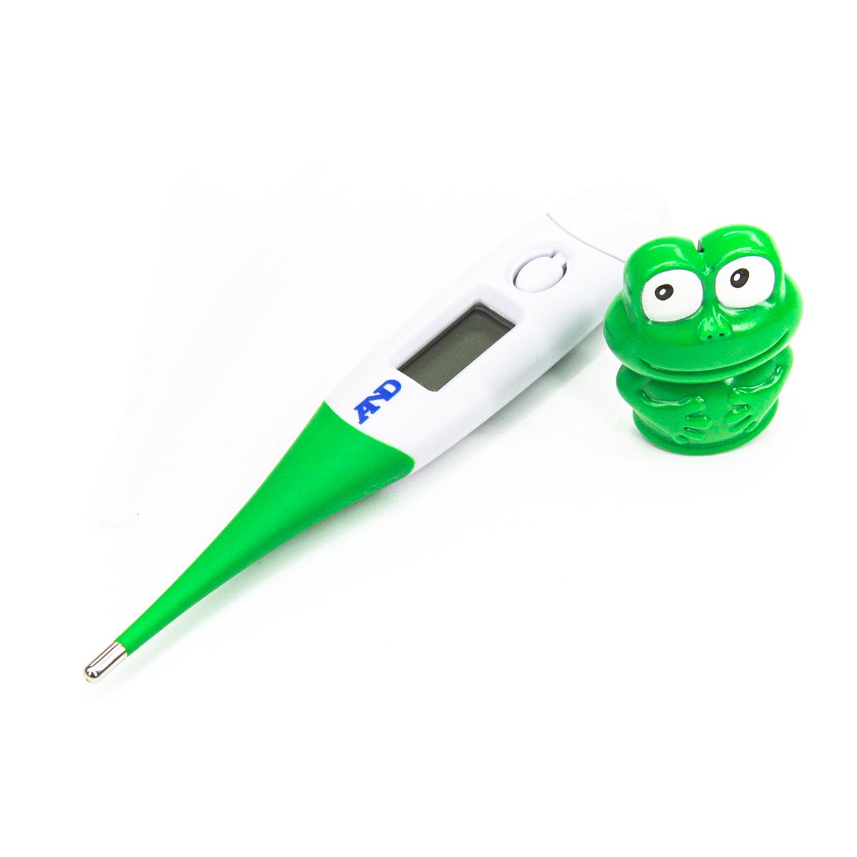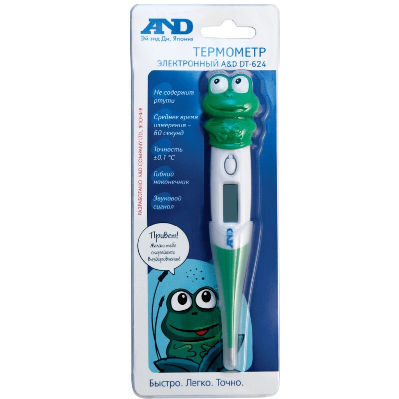 Электронный термометр (или градусник) AND DT-624, Лягушонок, предназначен для измерения температуры тела человека тремя способами: орально, в подмышечной впадине (аксиллярно) или ректально. Время измерения около 60 сек. Прибор отличает яркий и необычный дизайн, который выполнен в виде забавного лягушонка, наверняка, понравится детям.