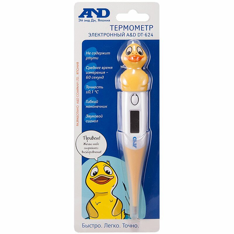Электронный термометр (или градусник) AND DT-624, Утенок, предназначен для измерения температуры тела человека тремя способами: орально, в подмышечной впадине (аксиллярно) или ректально. Время измерения около 60 сек. Прибор отличает яркий и необычный дизайн, который выполнен в виде забавного утенка, наверняка, понравится детям.