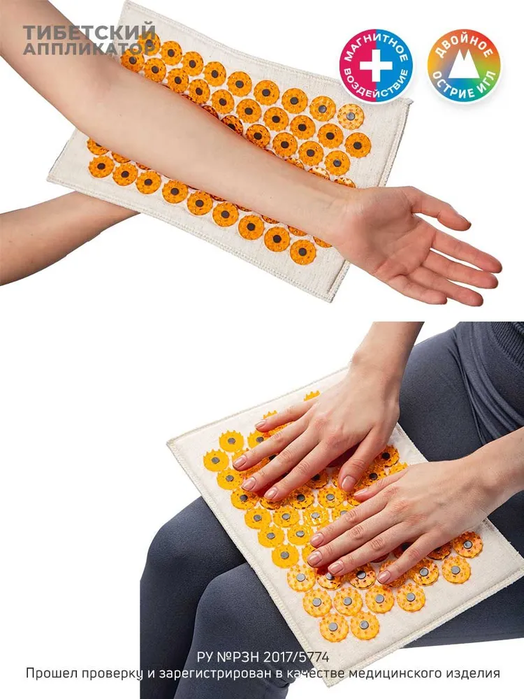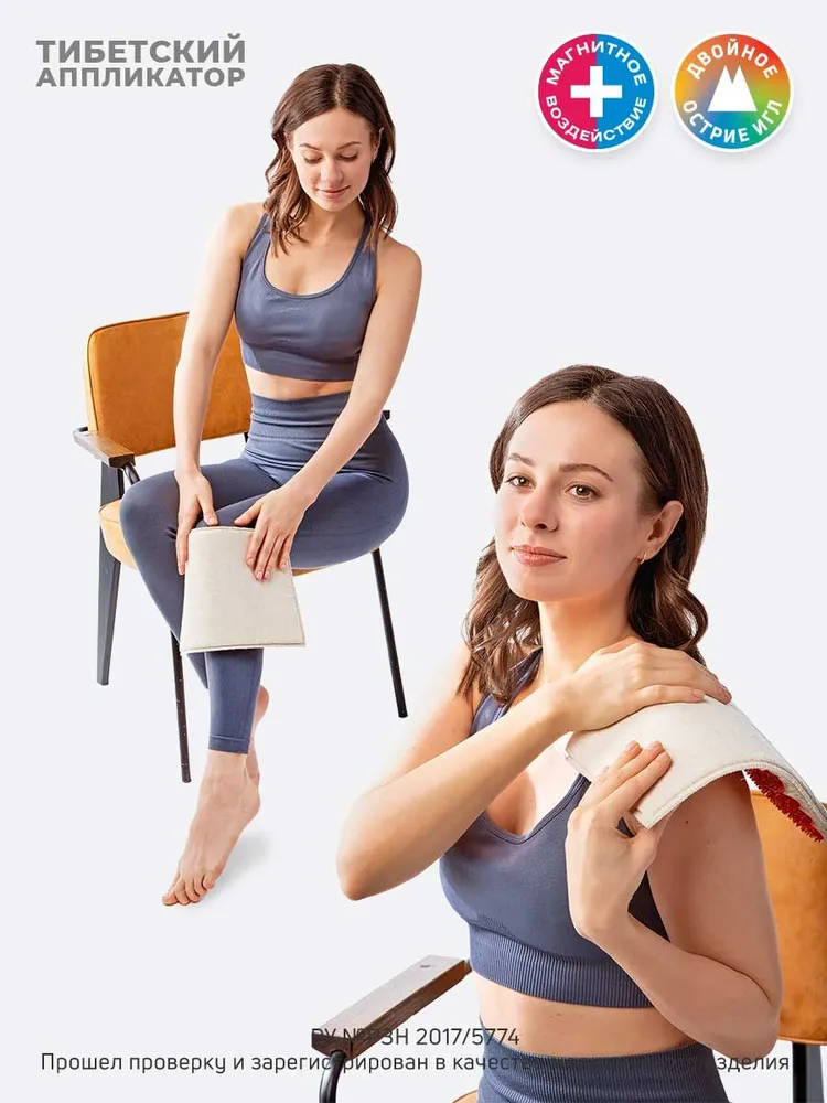 Тибетский аппликатор на мягкой подложке 17 x 28 см прижимается к поверхности кожи руками или с помощью веса тела. Возможно прижатие эластичным поясом или бинтом. Сила вдавливания должна обеспечить колющее воздействие в пределах болевой переносимости, которое обычно сопровождается ощущением тепла. Ощущение тепла свидетельствует о высокой эффективности воздействия. Время и сила воздействия являются индивидуальными для каждого человека и определяются опытным путем. Период воздействия может колебаться от одной минуты до нескольких часов, но в большинстве случаев процедура длится 5-15 минут. Рекомендуется проводить 1-2 процедуры в сутки. Проконсультируйтесь со специалистом об индивидуальных особенностях применения. Следующие способы применения эффективны в большинстве случаев: 1. Массажер кладут на горизонтальную поверхность (например, на кровать или на пол), затем на него ложатся, обеспечивая колющее воздействие с помощью веса тела. Процедура длится 5-15 минут. 2. Массажер накладывают на выбранную зону и надавливают на него руками в течение 40-60 секунд, после чего массажер снимают. Процедуру повторяют 5-10 раз с небольшими интервалами.