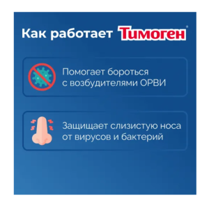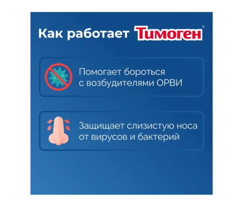 Детям: от 1 года до 6 лет 1 дозу в один носовой ход 1 раз в сутки, от 7 до 14 лет по 1 дозе в каждый носовой ход 1 раз в сутки. Препарат применяют в течение 10 дней с лечебной целью или в течение 3–5 дней с профилактической целью. Повторный курс Тимогена проводится не ранее, чем через 1 месяц.