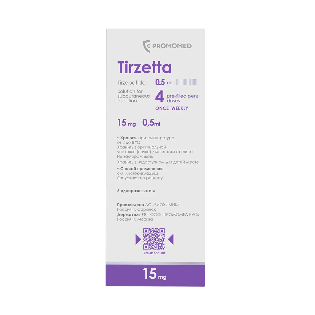 Каждый картридж содержит 15 мг тирзепатида в 0,5 мл раствора (30 мг/мл).