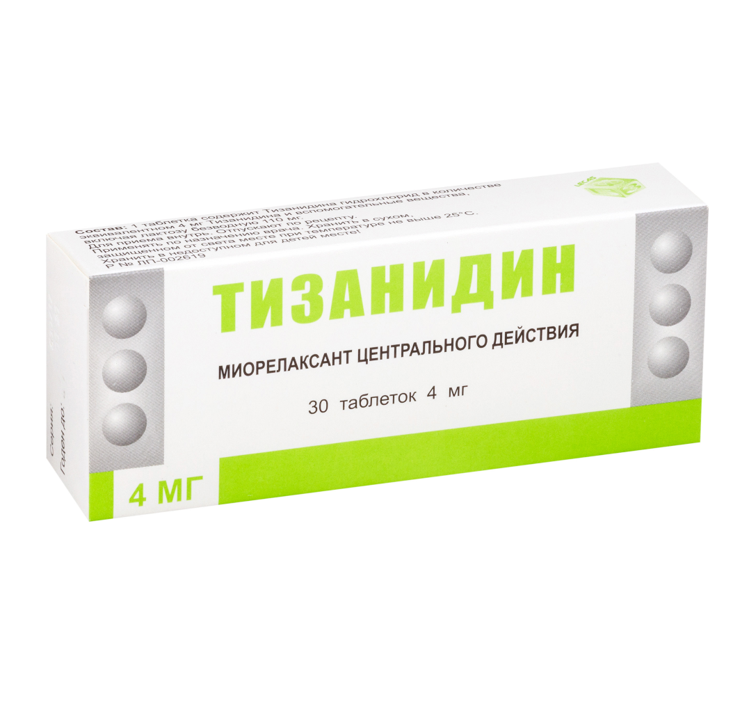 Активное вещество: Одна таблетка содержит активное вещество тизанидина гидрохлорид в количестве 4,576 мг, в пересчёте на тизанидин 4 мг.