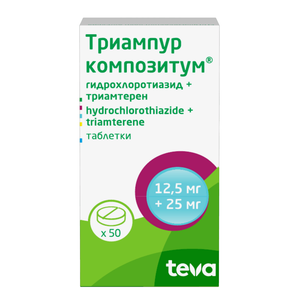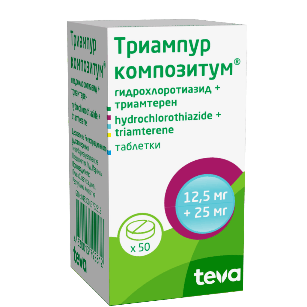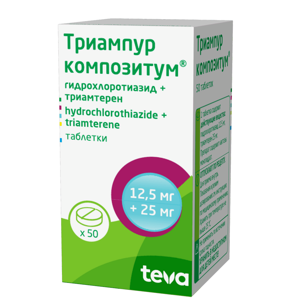 активные вещества: триамтерен 25,000 мг, гидрохлоротиазид 12,500 мг
