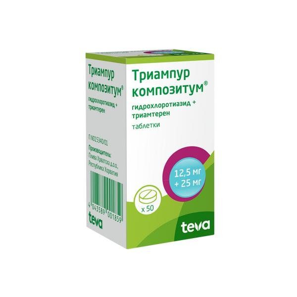Активные вещества: триамтерен 25,000 мг, гидрохлоротиазид 12,500 мг