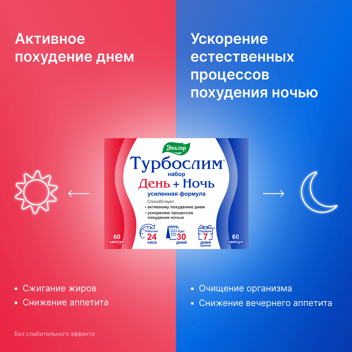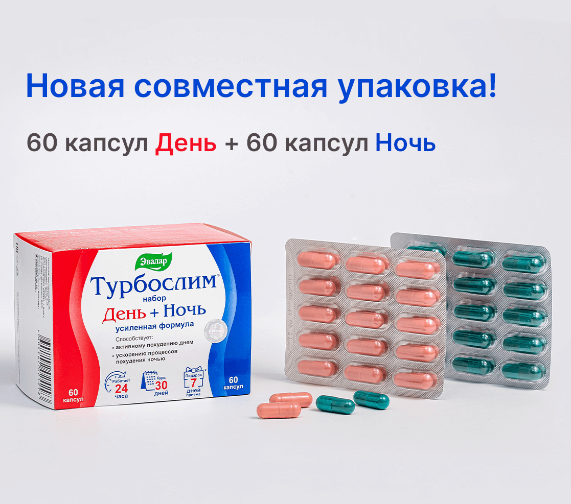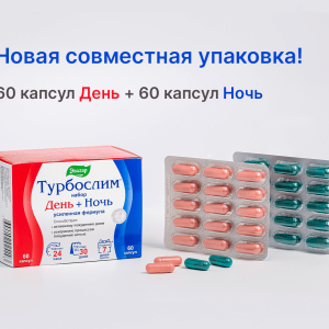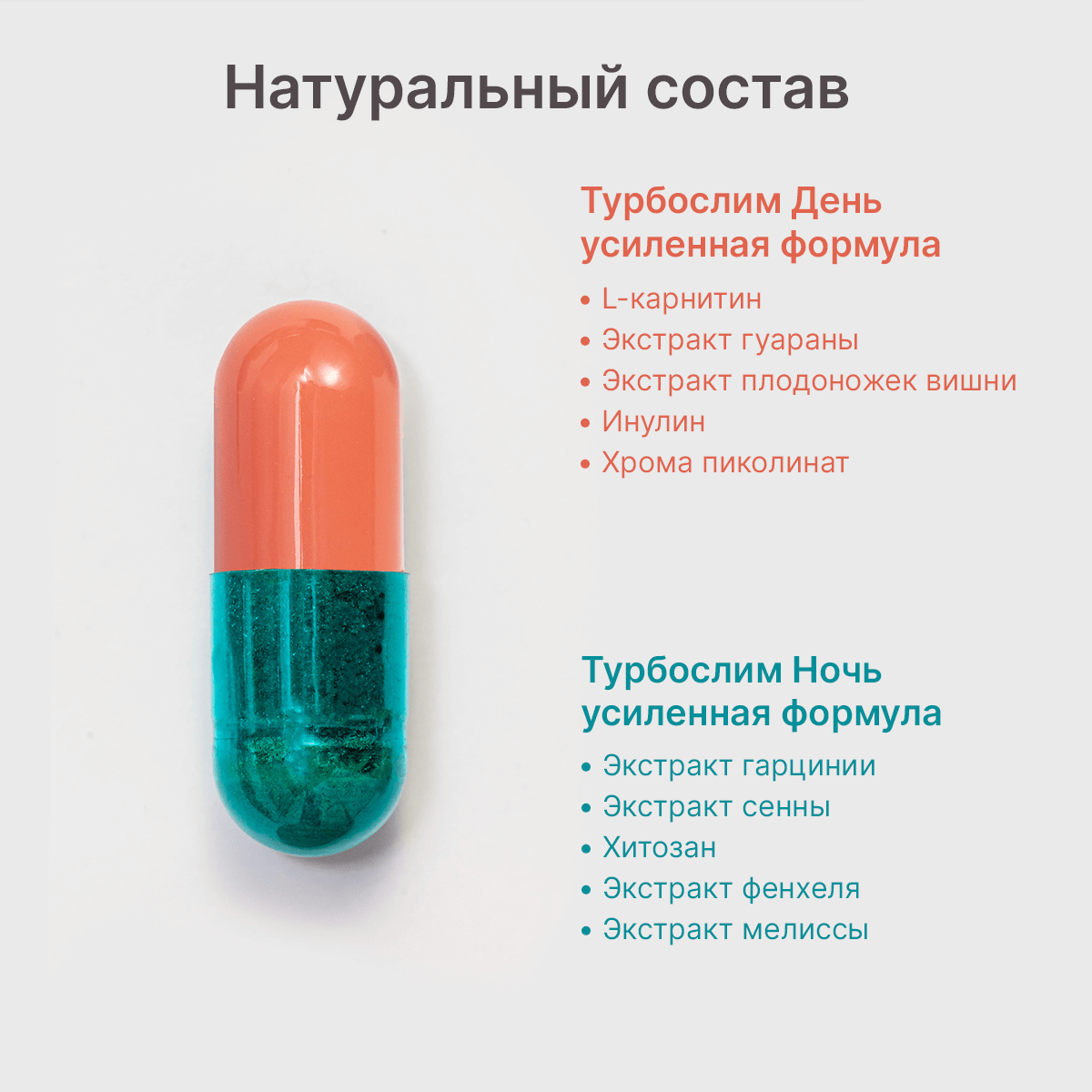 Для удобства применения и наилучшего результата легендарные капсулы Турбослим День усиленная формула и Турбослим Ночь усиленная формула – теперь в наборе, который будет работать на вашу стройность 24 часа в сутки 30 дней! Эти препараты разработаны для совместного применения и представляют собой не имеющий аналогов1 комплекс для похудения, учитывающий хронобиологию человека.