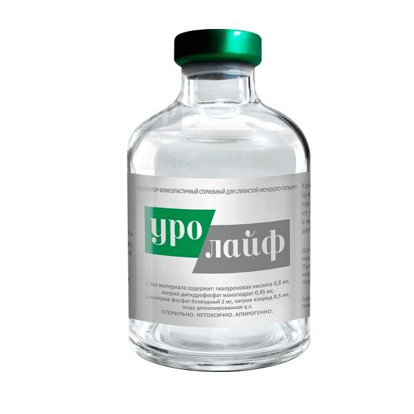 Протектор вязкоэластичный стерильный для слизистой мочевого пузыря «УРОЛАЙФ» - стерильный, апирогенный, прозрачный, упруговязкий, буферизованый, физиологический раствор гиалуроната натрия неживотного происхождения (рН 6,5 – 7,5). Поставляется в стеклянном герметично закрытом флаконе, в стерильном виде и предназначен только для инстилляций в мочевой пузырь.