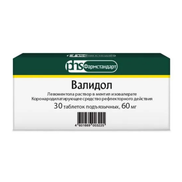 Активное вещество: ;левоментола раствор в ментил изовалерате (валидол) — 60 ;мг;