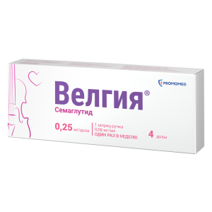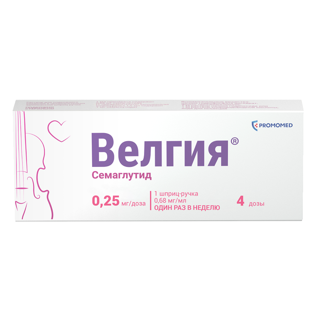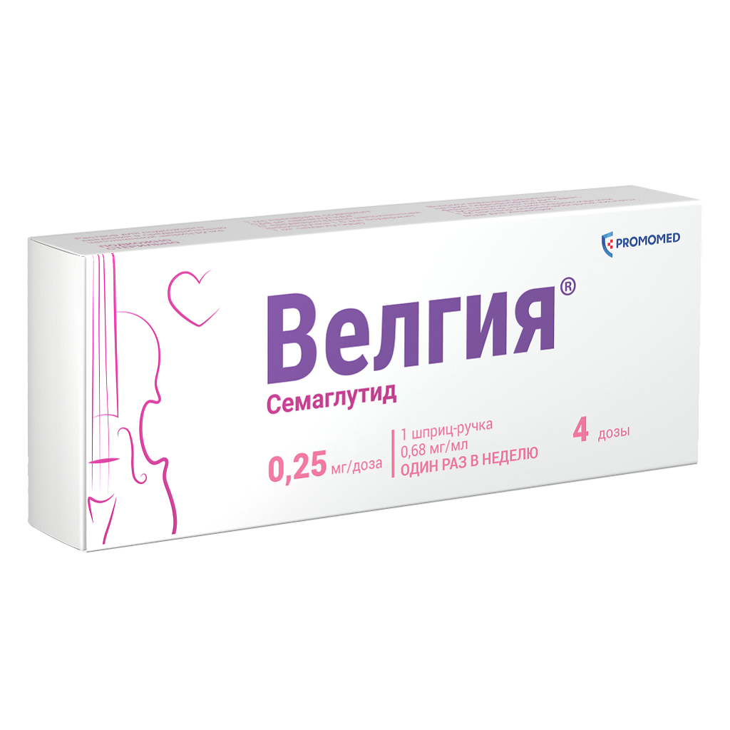 Велгия® — это препарат, содержащий действующее вещество семаглутид, который назначается в качестве дополнения к низкокалорийной диете и физической активности для коррекции и контроля массы тела. Семаглутид относится к средствам для лечения сахарного диабета гипогликемическим средствам, кроме инсулинов. Семаглутид является аналогом природного гормона — глюкагоноподобного пептида-1 (ГПП-1), который выделяется после приёма пищи и служит физиологическим регулятором углеводного обмена (уровня инсулина и глюкозы), а также аппетита и потребления пищи. Семаглутид воздействует на мишени (рецепторы) в головном мозге, которые контролируют аппетит, что помогает Вам быстрее почувствовать себя сытым, сохранить это ощущение надолго и снизить повышенную тягу к приёму пищи. Также семаглутид затормаживает эвакуацию пищи из желудка, что дополнительно поддерживает длительное ощущение сытости. Такой механизм поможет Вам привыкнуть к правильному питанию и эффективно снизить массу тела. При приёме семаглутида наблюдаются дополнительные эффекты, такие как уменьшение окружности талии, улучшение обмена веществ (уровня липидов, глюкозы и др.), улучшение параметров сердечно-сосудистой системы (артериальное давление, пульс). Снижение массы тела на фоне приёма семаглутида способствует уменьшению риска развития осложнений, связанных с наличием повышенной массы тела, в частности, сердечно-сосудистых заболеваний, сахарного диабета 2 типа (СД2), репродуктивных нарушений, заболеваний суставов, печени и др.