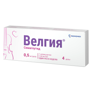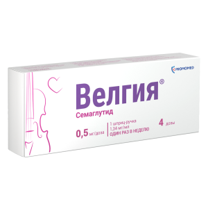 Велгия® — это препарат, содержащий действующее вещество семаглутид, который назначается в качестве дополнения к низкокалорийной диете и физической активности для коррекции и контроля массы тела. Семаглутид относится к средствам для лечения сахарного диабета гипогликемическим средствам, кроме инсулинов. Семаглутид является аналогом природного гормона — глюкагоноподобного пептида-1 (ГПП-1), который выделяется после приёма пищи и служит физиологическим регулятором углеводного обмена (уровня инсулина и глюкозы), а также аппетита и потребления пищи. Семаглутид воздействует на мишени (рецепторы) в головном мозге, которые контролируют аппетит, что помогает Вам быстрее почувствовать себя сытым, сохранить это ощущение надолго и снизить повышенную тягу к приёму пищи. Также семаглутид затормаживает эвакуацию пищи из желудка, что дополнительно поддерживает длительное ощущение сытости. Такой механизм поможет Вам привыкнуть к правильному питанию и эффективно снизить массу тела. При приёме семаглутида наблюдаются дополнительные эффекты, такие как уменьшение окружности талии, улучшение обмена веществ (уровня липидов, глюкозы и др.), улучшение параметров сердечно-сосудистой системы (артериальное давление, пульс). Снижение массы тела на фоне приёма семаглутида способствует уменьшению риска развития осложнений, связанных с наличием повышенной массы тела, в частности, сердечно-сосудистых заболеваний, сахарного диабета 2 типа (СД2), репродуктивных нарушений, заболеваний суставов, печени и др.