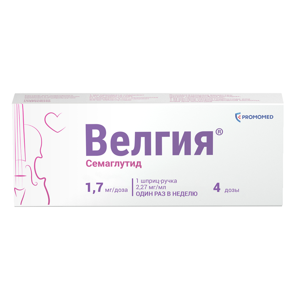 Велгия® — это препарат, содержащий действующее вещество семаглутид, который назначается в качестве дополнения к низкокалорийной диете и физической активности для коррекции и контроля массы тела. Семаглутид относится к средствам для лечения сахарного диабета гипогликемическим средствам, кроме инсулинов. Семаглутид является аналогом природного гормона — глюкагоноподобного пептида-1 (ГПП-1), который выделяется после приёма пищи и служит физиологическим регулятором углеводного обмена (уровня инсулина и глюкозы), а также аппетита и потребления пищи. Семаглутид воздействует на мишени (рецепторы) в головном мозге, которые контролируют аппетит, что помогает Вам быстрее почувствовать себя сытым, сохранить это ощущение надолго и снизить повышенную тягу к приёму пищи. Также семаглутид затормаживает эвакуацию пищи из желудка, что дополнительно поддерживает длительное ощущение сытости. Такой механизм поможет Вам привыкнуть к правильному питанию и эффективно снизить массу тела. При приёме семаглутида наблюдаются дополнительные эффекты, такие как уменьшение окружности талии, улучшение обмена веществ (уровня липидов, глюкозы и др.), улучшение параметров сердечно-сосудистой системы (артериальное давление, пульс). Снижение массы тела на фоне приёма семаглутида способствует уменьшению риска развития осложнений, связанных с наличием повышенной массы тела, в частности, сердечно-сосудистых заболеваний, сахарного диабета 2 типа (СД2), репродуктивных нарушений, заболеваний суставов, печени и др.