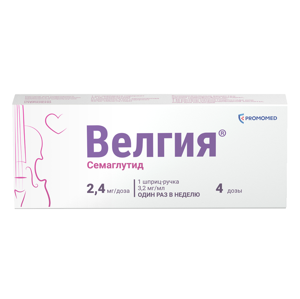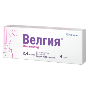 Велгия® — это препарат, содержащий действующее вещество семаглутид, который назначается в качестве дополнения к низкокалорийной диете и физической активности для коррекции и контроля массы тела. Семаглутид относится к средствам для лечения сахарного диабета гипогликемическим средствам, кроме инсулинов. Семаглутид является аналогом природного гормона — глюкагоноподобного пептида-1 (ГПП-1), который выделяется после приёма пищи и служит физиологическим регулятором углеводного обмена (уровня инсулина и глюкозы), а также аппетита и потребления пищи. Семаглутид воздействует на мишени (рецепторы) в головном мозге, которые контролируют аппетит, что помогает Вам быстрее почувствовать себя сытым, сохранить это ощущение надолго и снизить повышенную тягу к приёму пищи. Также семаглутид затормаживает эвакуацию пищи из желудка, что дополнительно поддерживает длительное ощущение сытости. Такой механизм поможет Вам привыкнуть к правильному питанию и эффективно снизить массу тела. При приёме семаглутида наблюдаются дополнительные эффекты, такие как уменьшение окружности талии, улучшение обмена веществ (уровня липидов, глюкозы и др.), улучшение параметров сердечно-сосудистой системы (артериальное давление, пульс). Снижение массы тела на фоне приёма семаглутида способствует уменьшению риска развития осложнений, связанных с наличием повышенной массы тела, в частности, сердечно-сосудистых заболеваний, сахарного диабета 2 типа (СД2), репродуктивных нарушений, заболеваний суставов, печени и др.