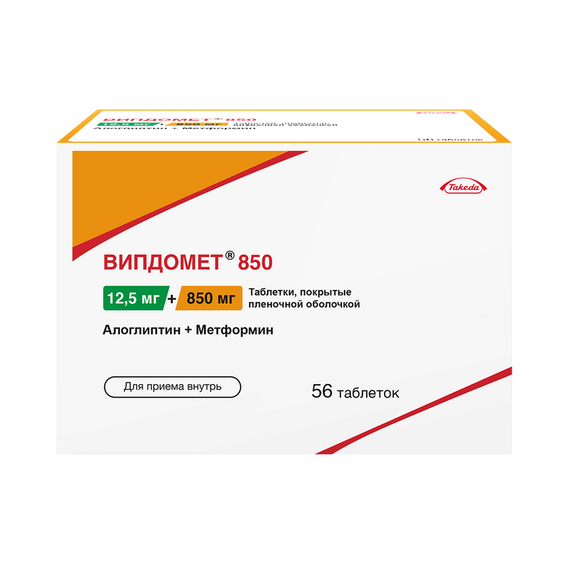 Препарат Випдомет® 850 представляет собой комбинацию двух гипогликемических средств с взаимодополняющими и разными механизмами действия, предназначенную для улучшения контроля гликемии у пациентов с сахарным диабетом 2 типа (СД2): алоглиптина, ингибитора фермента дипептидилпептидазы-4 (ДПП-4), и метформина, представителя класса бигуанидов.