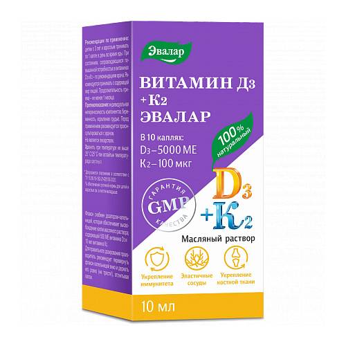 Витамин Д3 500 МЕ + К2в каплях от компании «Эвалар» содержит популярный витамин D, усиленный натуральным витамином К2, который дополняет действие витамина D и помогает ему лучше усваиваться. Витамин Д3 500 МЕ + К2способствует укреплению иммунитета, нормализации кальциевого обмена – направляет кальций в костные ткани, препятствуя его отложению в сосудах (безопасное усвоение кальция), повышению эластичности сосудов, предотвращению кальцификации тканей (снижению скорости старения), поддержанию здоровья костей, зубов.