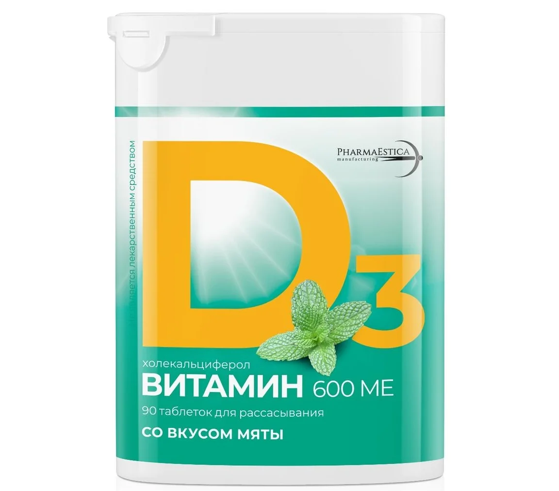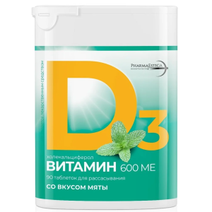 Витамин Д3 600 МЕ таблетки для рассасывания со вкусом мяты. Витамин D способствует: Укреплению иммунитета. Снижению риска простудный заболеваний, в том числе для профилактики COVID 19 Улучшению состояния костной ткани и зубов Снижению риска развития остеопороза Повышению силы мышц и общей выносливости Поддержанию сердечно-сосудистой, эндокринной, нервной систем и репродуктивной функции организма Повышению уровня "гормона счастья" - серотонина Преимущества таблеток для рассасывания Три приятных вкуса, не требует запивания водой и полоскания рта после приема Таблетка быстро растворяется во рту, за счет чего витамин D лучше усваивается организмом Не требует приема в сочетании с жирной пищей Эффективность не зависит от состояния желудочно-кишечного тракта Подходит для лиц с нарушениями пищеварения, проблемами с желчным пузырем В 1 таблетке содержится суточная норма витамина D Производится из европейского сырья на современном заводе в Эстонии