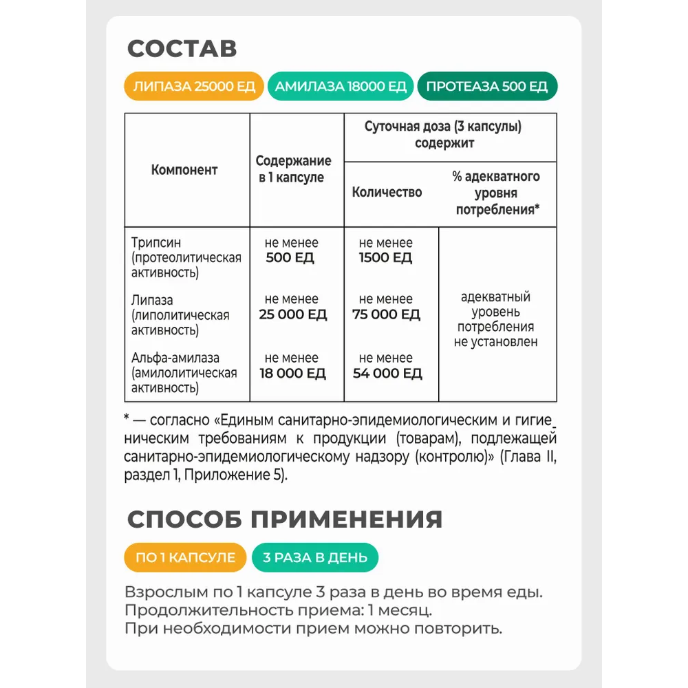 пеллеты (смесь пищеварительных ферментов, стандартизованных по удельной активности [фермент альфа-амилаза (из поджелудочных желез крупного рогатого скота, свиней), фермент липаза (из поджелудочных желез крупного рогатого скота), фермент трипсин (из поджелудочных желез крупного рогатого скота, свиней)], агент антислеживающий – микрокристаллическая целлюлоза, оболочка пеллеты (загуститель – гидроксипропилметилцеллюлоза, глазирователь – полиэтиленгликоль, краситель – диоксид титана), стабилизатор – полиэтиленгликоль), оболочка капсулы (желатин, фталат гидроксипропилметилцеллюлозы, красители: оксид железа красный, оксид железа черный).
