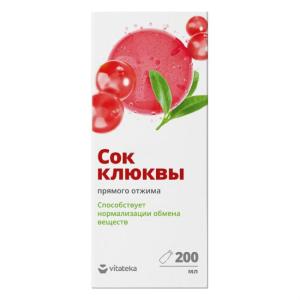 Специализированный пищевой продукт диетического профилактического питания для снижения риска развития ожирения и коррекции тела. Готовая форма сока для приготовления напитков, морсов, в качестве базы для приготовления теплого питья при ОРВИ. Плоды клюквы богаты комплексом биологически активных веществ, включая лимонную и бензойную кислоты, пектины, витамины группы В и витамин С, калий, полифенолы, проантоцианидины, обуславливающие широкий спектр свойств сока. Биологически активные вещества сока клюквы способствуют нормализации липидного профиля крови (холестерин) и поддержанию кардиометаболического здоровья, нормализации работы мочеполовой системы при циститах, общему укреплению здоровья.