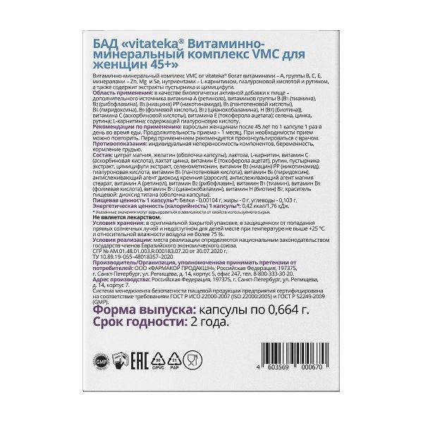 Витатека Витаминно-минеральный комплекс VMC для женщин 45+ капсулы 0,664г №30