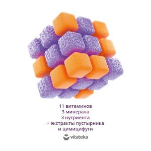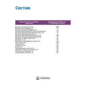 Содержит 11 витаминов, 3 минерала, 4 нутриента и экстракт цимицифуги для поддержания женского организма в климактерический период.