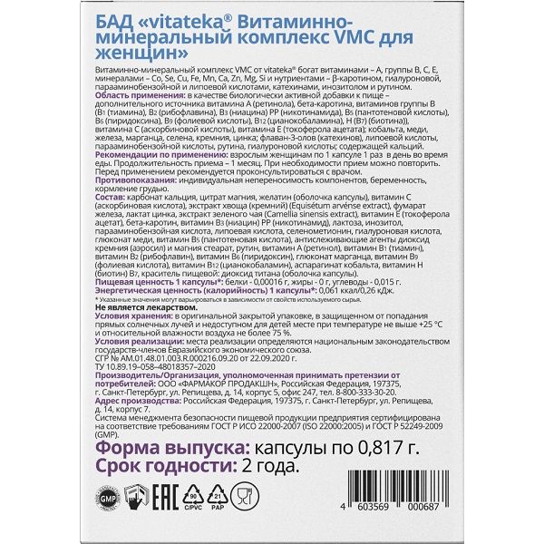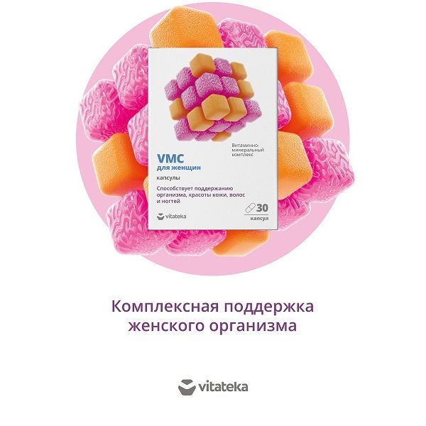Витаминно-минеральный комплекс VMC для женщин от vitateka® богат витаминами – А, группы В, С, Е, минералами – кобальтом, селеном, медью, железом, марганцем, кальцием, цинком, магнием, селеном и нутриентами – β-каротином, гиалуроновой, парааминобензойной и липоевой кислотами, катехинами, инозитолом и рутином. Способствует поддержанию женского организма, красоты кожи, волос и ногтей.