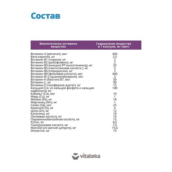 Карбонат кальция, цитрат магния, желатин (оболочка капсулы), витамин С (аскорбиновая кислота), экстракт хвоща (кремний) (Equisétum arvénse extract), фумарат железа, лактат цинка, экстракт зеленого чая (Camellia sinensis extract), витамин Е (токоферола ацетат), бета-каротин, витамин В3 (ниацин) РР (никотинамид), лактоза, инозитол, парааминобензойная кислота, липоевая кислота, селенометионин, гиалуроновая кислота, глюконат меди, витамин В5 (пантотеновая кислота), антислеживающие агенты диоксид кремния (аэросил), магния стеарат рутин, витамин А (ретинол), витамин В1 (тиамин), витамин В2 (рибофлавин), витамин В6 (пиридоксин), глюконат марганца, витамин В9 (фолиевая кислота), витамин В12 (цианокобаламин), аспарагинат кобальта, витамин Н (биотин) В7, краситель пищевой диоксид титана (оболочка капсулы).