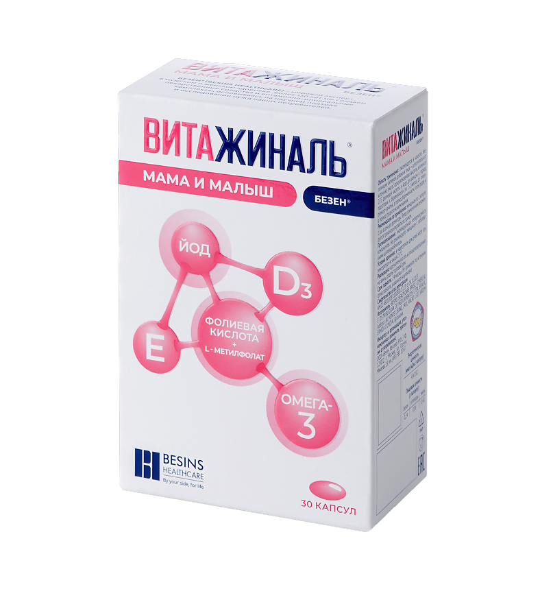 ВИТАЖИНАЛЬ® МАМА И МАЛЫШ БЕЗЕН® — это биологически активная добавка к пище для женщин, планирующих беременность, во время беременности, после родов и кормящих грудью. Известно, что во время подготовки и в течение самой беременности и лактации организму женщины требуется большее количество витаминов и микроэлементов, недостаток которых может привести к негативным изменениям в организме матери или плода. В такой ситуации рациональным представляется их дополнительный прием не только во время беременности, но и на этапе её планирования, и в период лактации. Прием сбалансированного базового комплекса жизненно необходимых элементов Витажиналь® Мама и Малыш Безен® способствует восполнению уже имеющегося дефицита необходимых составляющих здорового питания, что благоприятно отражается как на здоровье женщины, так и на развитии плода.