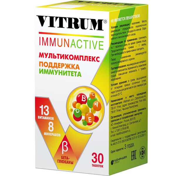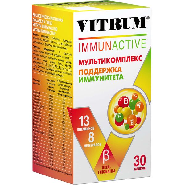 Витаминно-минеральный комплекс ВИТРУМ ИММУНАКТИВ VITRUM IMMUNACTIVE содержит 13 витаминов и 8 минералов, а также бета-глюканы и биофлаваноидный комплекс — необходимые компоненты, которые синергично работают для поддержки иммунитета: