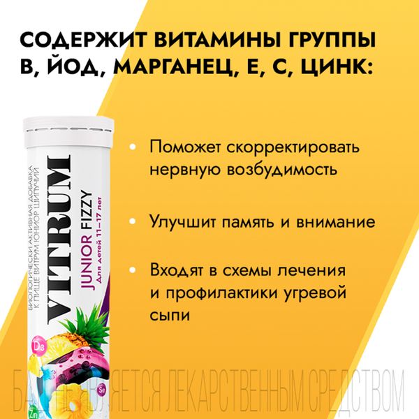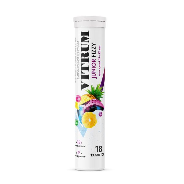 Витаминно-минеральный комплекс ВИТРУМ® ЮНИОР ШИПУЧИЙ/ VITRUM® JUNIOR FIZZY — для детей и подростков 11–17 лет. Содержит 13 витаминов и 9 минералов, в том числе — актуальные для данного возраста: витамины группы В, йод, и марганец — для улучшения памяти и внимания и снижения нервной возбудимости в период высоких умственных и эмоциональных нагрузок, а так же витамины группы В, Е, С и цинк, которые входят в схемы лечения и профилактики угревой сыпи.