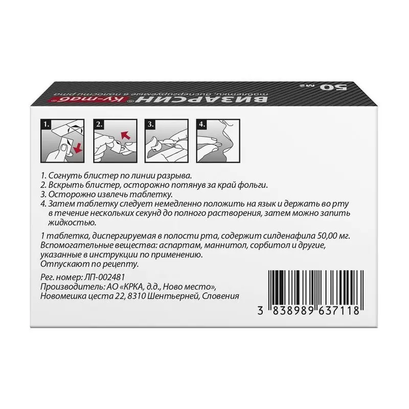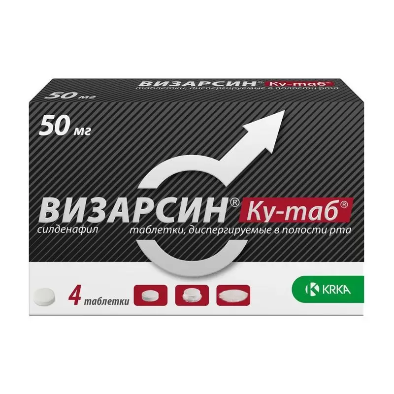 Рекомендуемая доза составляет 50 мг, которая принимается при необходимости, примерно за 1 час до предполагаемой сексуальной активности. В зависимости от эффективности и переносимости дозу препарата Визарсин® Ку-таб® можно увеличить до 100 мг или снизить до 25 мг. Максимальная рекомендуемая доза составляет 100 мг. Максимальная рекомендуемая частота применения препарата составляет 1 раз в сутки.