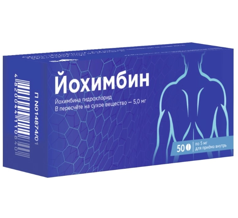 Действующее вещество: Йохимбина гидрохлорид в пересчёте на сухое вещество —5,0 мг.