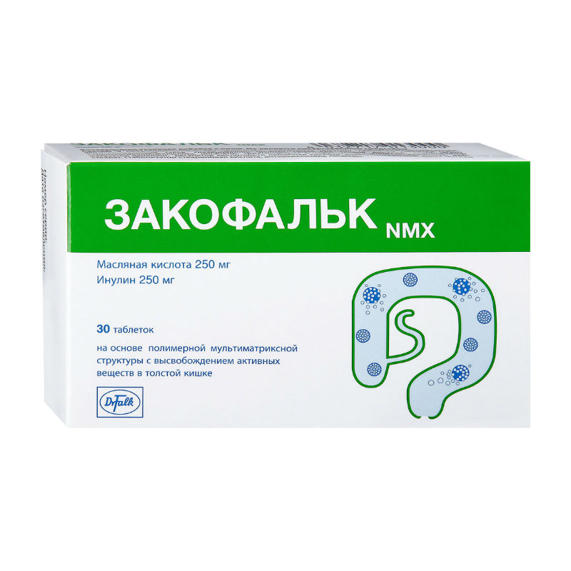 Биологически активная добавка к пище в таблетках на основе полимерной мультиматриксной структуры с высвобождением масляной кислоты и инулина непосредственно в толстой кишке. Закофальк - восполняющее дефицит масляной кислоты и инулина.