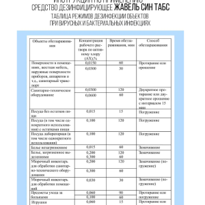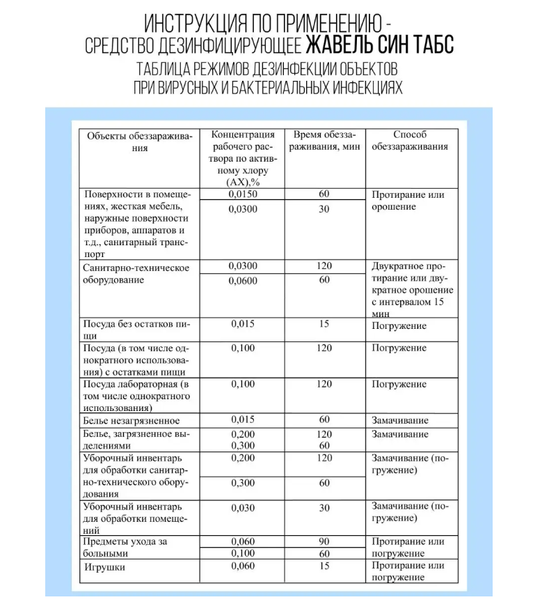Дезинфекцию и уборку проводят различными способами: протирание дезинфицирующим хлорным раствором, орошение с помощью аэрозоля, замачивание в концентрате. Время растворения хлорной таблетки для дезинфекции около 6 минут.