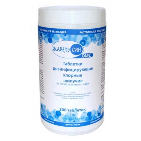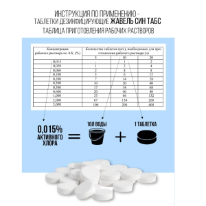 Дезинфицирующее средство Жавель Син Табс таблетки 300 штук. Средство «Жавель Син Табс» представляет собой таблетки цилиндрической формы с одной фаской белого цвета с характерным запахом хлора, массой 3,6±0,3 г. В качестве действующего вещества в состав средства входит натриевая соль дихлоризоциануровой кислоты–80,5%, а также вспомогательные вещества (адипиновая кислота, натрий карбонат и натрий бикарбонат). Массовая доля активного хлора г, таблетки 1,70±0,17. Время растворения таблетки не более 15 минут.