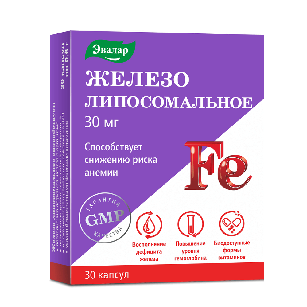 Для высокого усвоения1 железа попробуйте Железо липосомальное от «Эвалар». Препарат представляет собой инновационный легкоусвояемый источник железа в липосомальной форме.