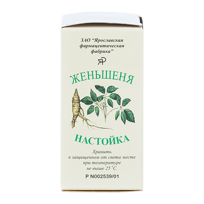 Настойка (1:10) на 70% спирте из корней женьшеня настоящего (Panax ginseng) семейства аралиевых (Araliaceae).