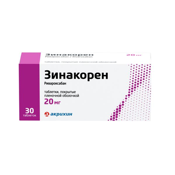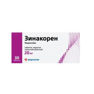 для предупреждения образования тромбов в венах у пациентов после больших ортопедических операций на ногах, например, эндопротезирования тазобедренного или коленного суставов — одна таблетка препарата Зинакорен 10 мг один раз в сутки, для предупреждения повторного образования тромбов в венах ног (тромбоз глубоких вен) и в кровеносных сосудах лёгких (тромбоэмболия лёгочной артерии) после как минимум 6 месяцев антитромботического лечения, рекомендованная доза составляет 1 таблетка 10 мг один раз в сутки или одна таблетка 20 мг один раз в сутки. Ваш лечащий врач назначил Вам дозу 1 таблетка препарата Зинакорен 10 мг 1 раз в день.